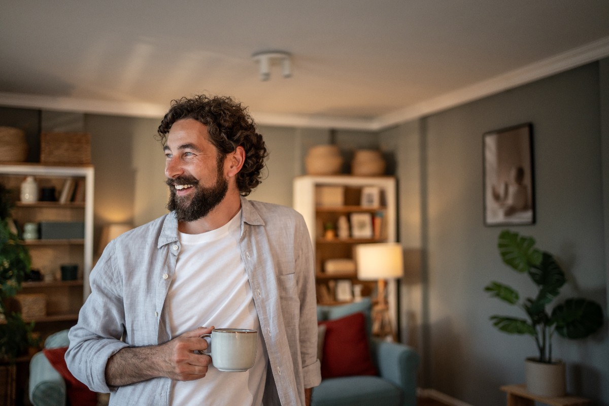 Primo piano di un ragazzo sorridente con una tazza nel proprio salotto. - www.notiziebenessere.it