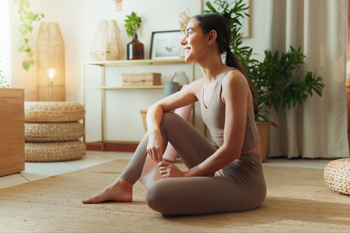 Benessere: ragazza nel salotto di casa in abbigliamento sportivo. - www.notiziebenessere.it